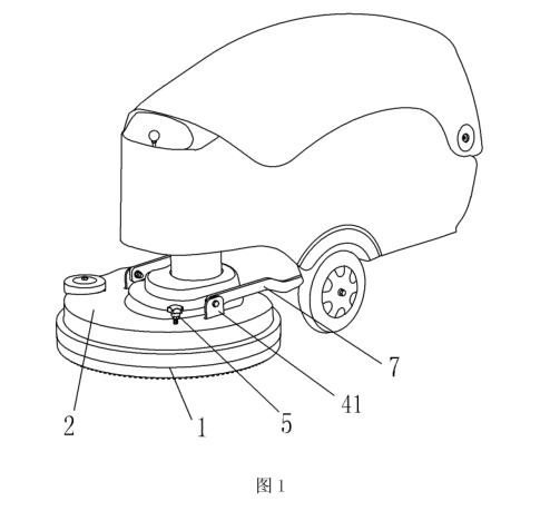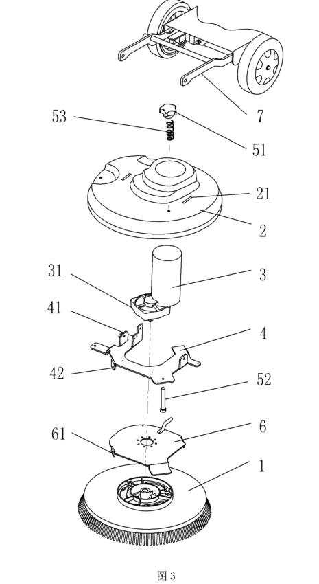 有益效果是:本實(shí)用新型在使用過程中,當(dāng)調(diào)節(jié)螺栓向下運(yùn)動(dòng)吋,電機(jī)固定板受カ繞鉸接軸轉(zhuǎn)動(dòng),產(chǎn)生偏擺,也帶動(dòng)刷盤組件向一側(cè)偏擺,從而増大了刷盤毛單側(cè)對(duì)地面的壓力,進(jìn)而在刷盤旋轉(zhuǎn)過程中形成了一定的牽引力,使刷盤轉(zhuǎn)動(dòng)更加輕松,減輕了操作者的疲勞強(qiáng)度;同時(shí),可根據(jù)地面條件的不同,對(duì)調(diào)節(jié)螺栓的旋入程度進(jìn)行調(diào)整,即調(diào)整對(duì)電機(jī)固定板的壓カ大小,從而改變刷盤毛單側(cè)對(duì)地面的壓力,以實(shí)現(xiàn)不同地面條件下牽引力大小的適度調(diào)整。