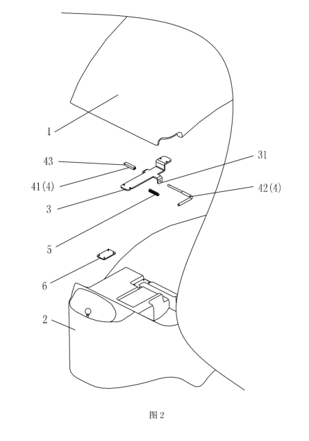 組裝時,將鎖扣拉桿42、鎖扣銷41分別穿過固定板3兩端的支耳31,將彈簧5套裝在鎖扣拉桿42上,然后將鎖扣拉桿42與鎖扣銷41固定連接。