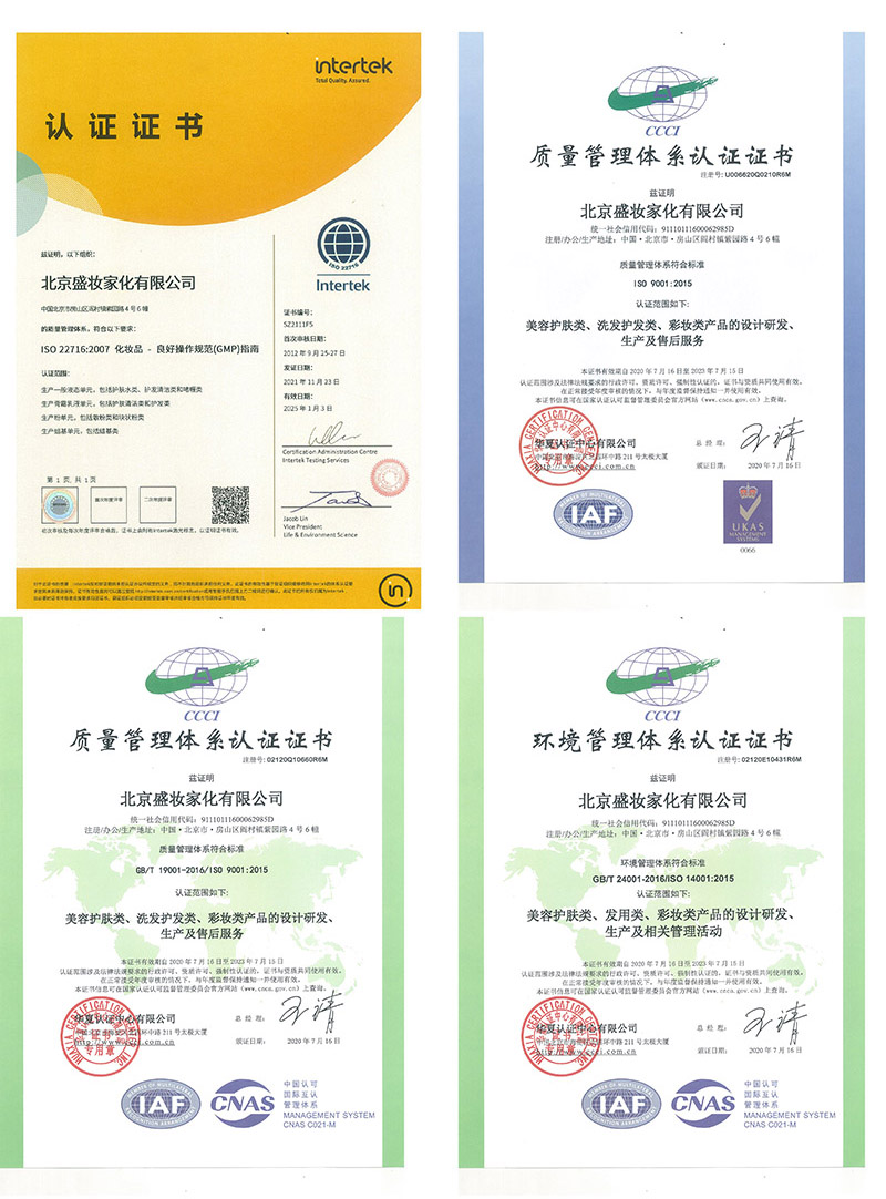 盛妝通過了ISO9001/ISO14001/UKAS/GMPC國際標準認證,具有雄厚的研發(fā)實力,攜手國內(nèi)尖端研發(fā)隊伍。 2015年與北京工商大學合作,成為北京工商大學在校生的校外實踐基地。2021年與北京師范大學科技集團合作,加入“北京美麗健康產(chǎn)業(yè)創(chuàng)新研究院”。2021年與北京中醫(yī)藥大學中藥學院劉永剛教授帶領的研發(fā)團隊簽署了八大系列中藥化妝品配方及工藝研究的合作協(xié)議。共同為中醫(yī)漢方產(chǎn)品的研發(fā)、植物提取應用等提供技術(shù)支持,創(chuàng)新中醫(yī)漢方在化妝品領域的應用,打造優(yōu)質(zhì)國貨精品!