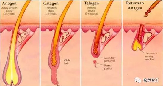 頭發(fā)有自己的生長周期,最開始是好幾年的生長期(anagen),然后是1-2周的退行期(catagen),到最后是1個多月的靜止期(telogen),然后就脫落了,再回到生長期。